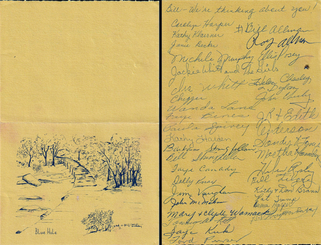 At the beginning of 1975, Bill began to experience medical issues that were soon diagnosed as cancer. Bill’s condition worsened quickly and by spring was often debilitating. Bill’s son Jack moved to Liberty Hill to care for his father. In fall ’75, Bill underwent exploratory surgery at the VA Hospital in nearby Temple, and, on returning from the hospital, received a “get well” card from the Liberty Hill Cafe, one of Bill’s favorite hangouts. The card appeared to be signed by almost everyone in the community.