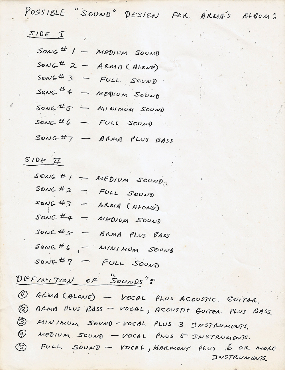 The Sonobeat archives are imprecise regarding the date Arma’s single was released, but Bill’s private notes indicate that on March 27, 1975, he gave Nashville Records approval to press a short run of 200 copies, which made a late April release of the single likely. This was Arma’s only release on the Sonobeat label, Sonobeat’s only commercial release in 1975, and Sonobeat’s only folk release, although it had recorded unreleased material by other folk artists, including Allen Damron and Cody Hubach. Arma’s was one of two Sonobeat releases in which the artist was listed on the label only by first name; the other is Jeannine Hoke, listed on her 1976 release as “Jeannine”, and whose single was Sonobeat’s final release.