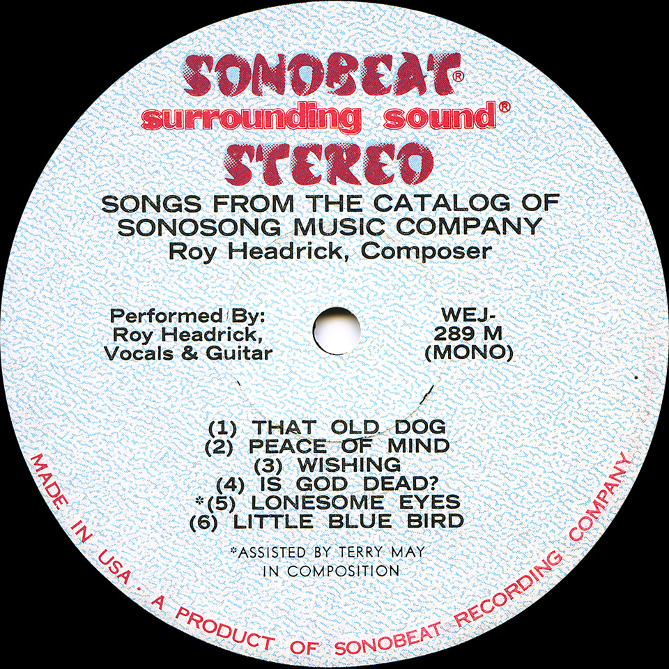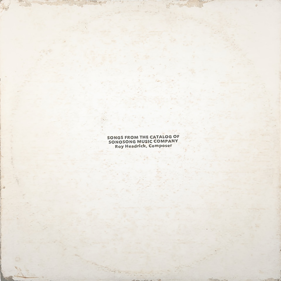 Plain white jacket rubber stamped “SONGS FROM THE CATALOG OF SONOSONG MUSIC COMPANY” and “Roy Headrick, Composer”