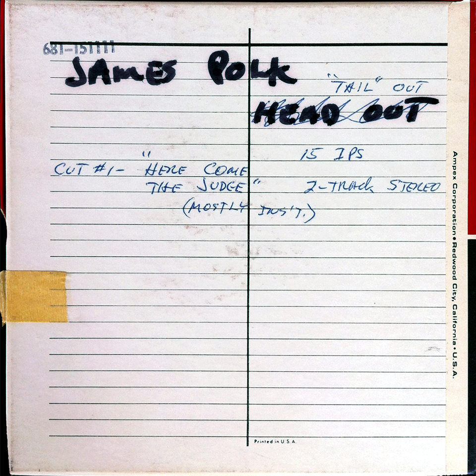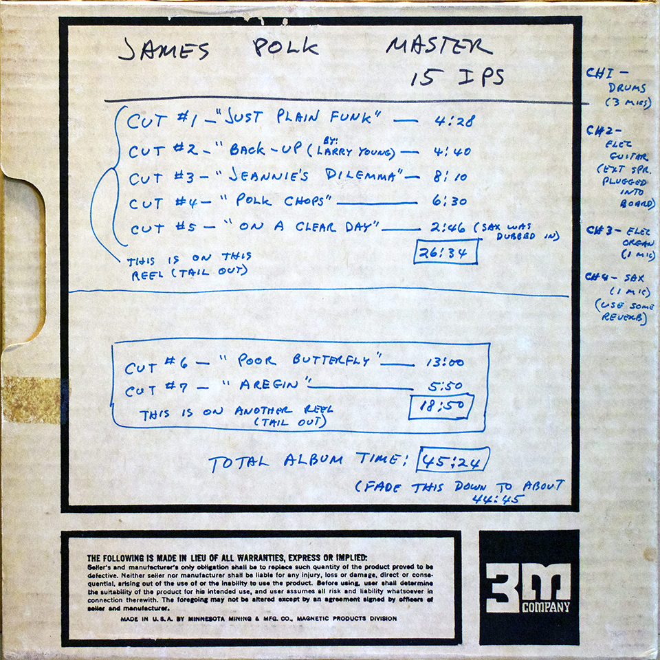 As March 1971 began, Polk returned to cut an album for Bill Sr., but the Sonobeat archives are unclear where the sessions were recorded or who the session players were. However it’s likely these sessions also were recorded at Sonobeat’s Western Hills Drive studio and featured only James, a drummer (likely John Taylor), a guitarist (probably Tim Pickard), and a sax player (almost certainly Reginald Caldwell). James played the bass lines using the foot pedals on his Hammond B3 organ. The resulting 45 minute untitled album featured seven tracks, one weighing in at a hefty 13 minutes. The half-inch 4-track master tape box indicates that Bill Sr., who both produced and engineered the sessions, covered the drum kit with three mikes, “tapped” the guitar amp speaker – which bypassed the need for a microphone, injecting the speaker output directly into the mixing console – and placed one mike on each of the organ and sax. The album contains a mix of cover versions of pop tunes, such as the Burton Lane-Alan Jay Lerner Broadway classic On a Clear Day (You Can See Forever), and Polk originals, including the fun and funky Polk Chops. Poor Butterfly is a cover of a pop classic dating from 1916 and popularized in the 1940s by Benny Goodman’s big band. A spunky piece entitled Aregin doesn’t seem to be a misspelling of Mile Davis’ Airegin, as they sound musically unrelated, but we don’t know who composed the Polk Aregin. Bill Sr. was looking to create an album that he could sell to a national label, but there were no takers.