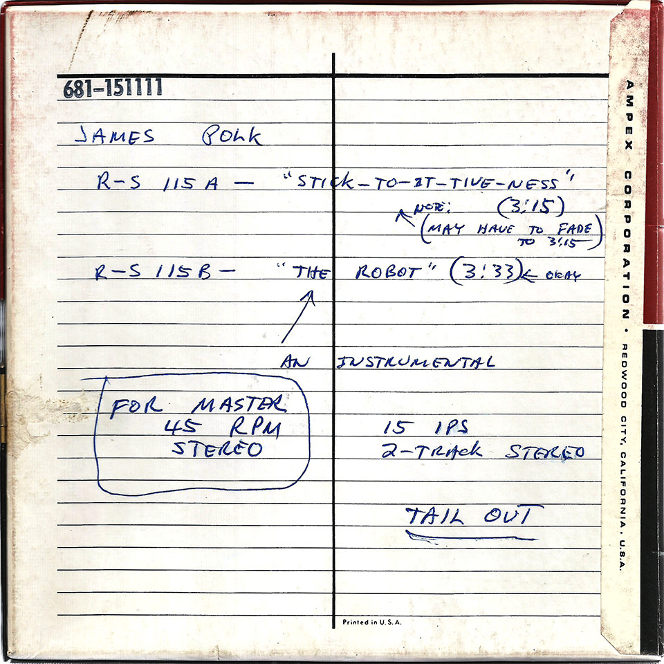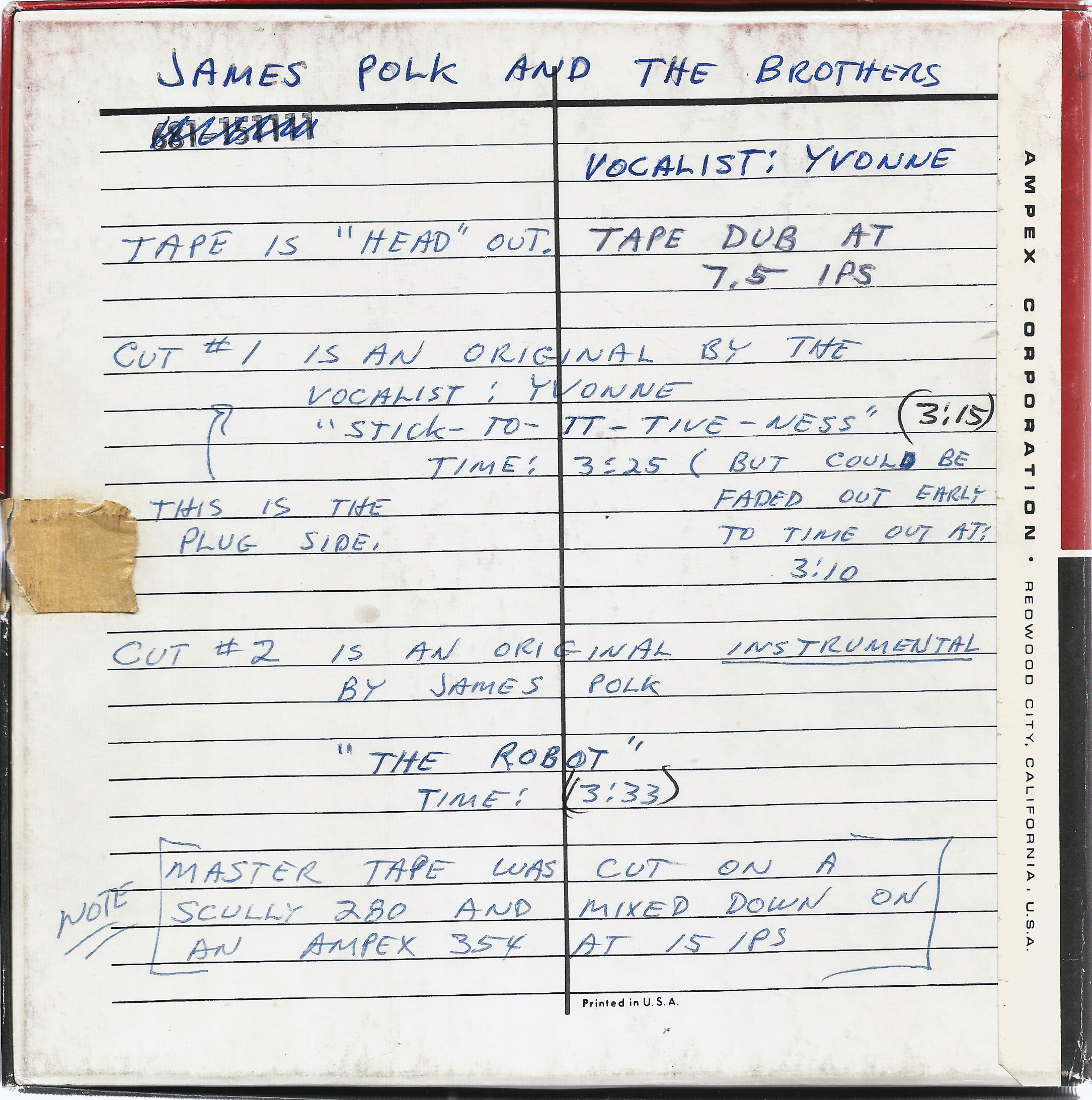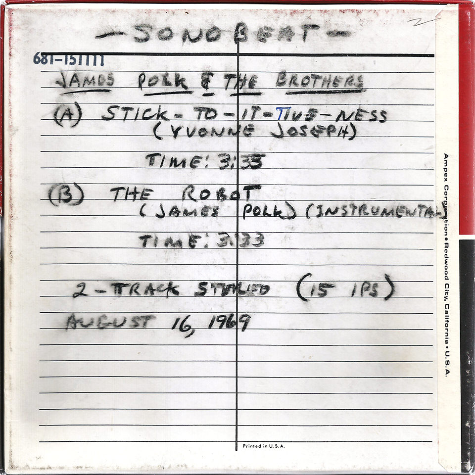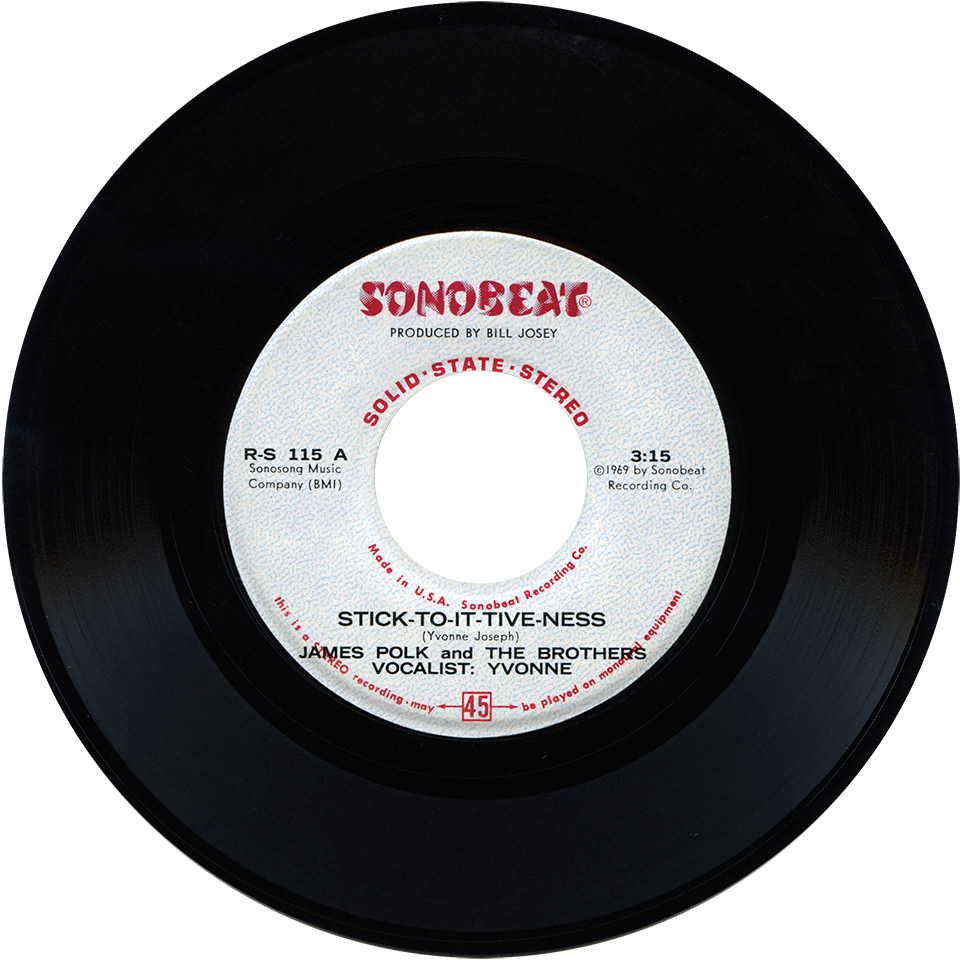 Sonobeat’s James Polk sessions yielded two solid original songs that were released as Sonobeat stereo 45 RPM single R-s115. The session also yielded an additional track, a cover of Shorty Long’s 1968 R&B hit Here Comes the Judge, which was not considered for the single. With a positive message, the gospel-influenced “A” side, Stick-To-It-Tive-Ness, is San Antonio native Yvonne Joseph’s original composition on which she sang lead. Teresa Maxwell and James’ wife Imogene provided backing vocals. The single’s “B” side, The Robot, is a slow, jazz-influenced and slightly contorted instrumental written by Polk that might have started a dance craze had it been the “A” side. The James Polk and The Brothers single really deserved a picture sleeve, like Sonobeat’s earlier singles releases, but by 1969, Sonobeat had given up on the extra effort and expense to make them.