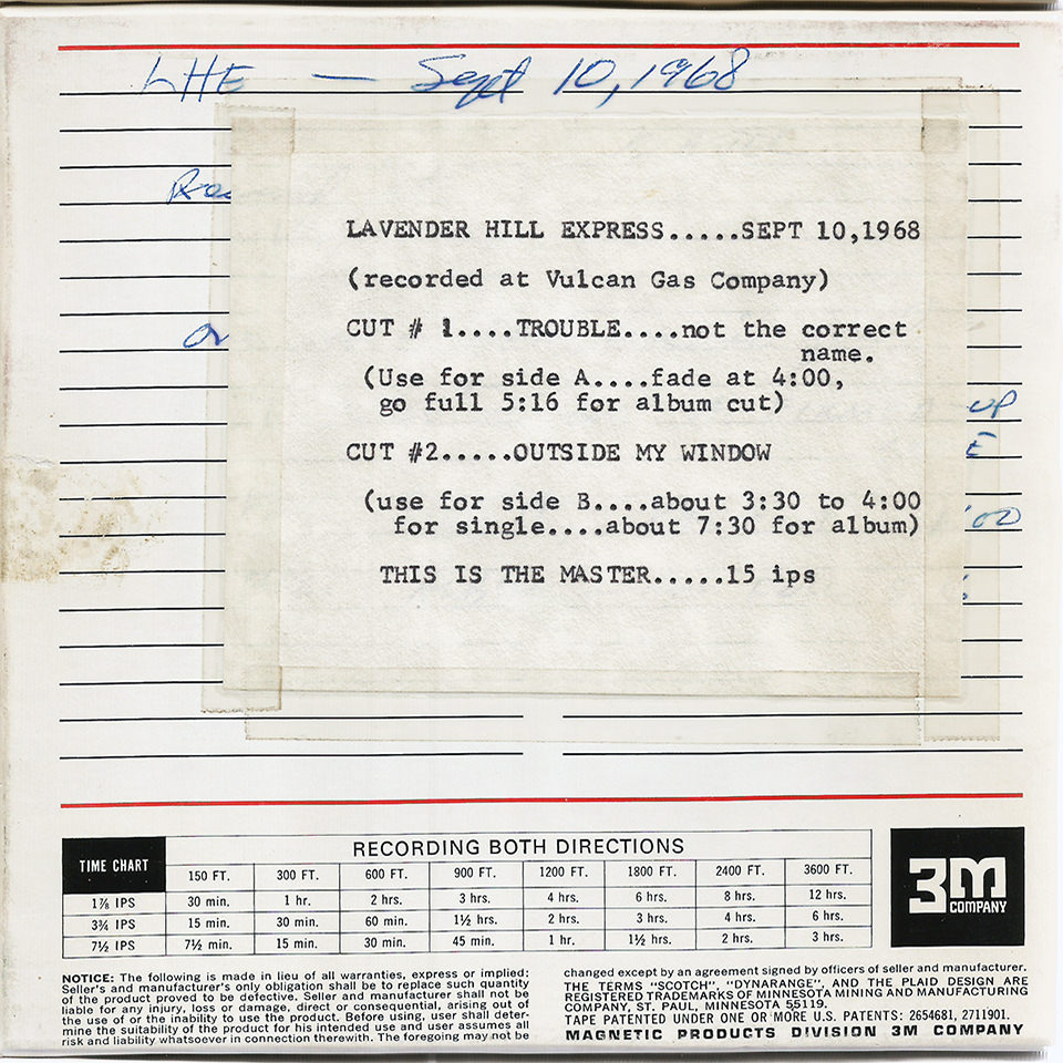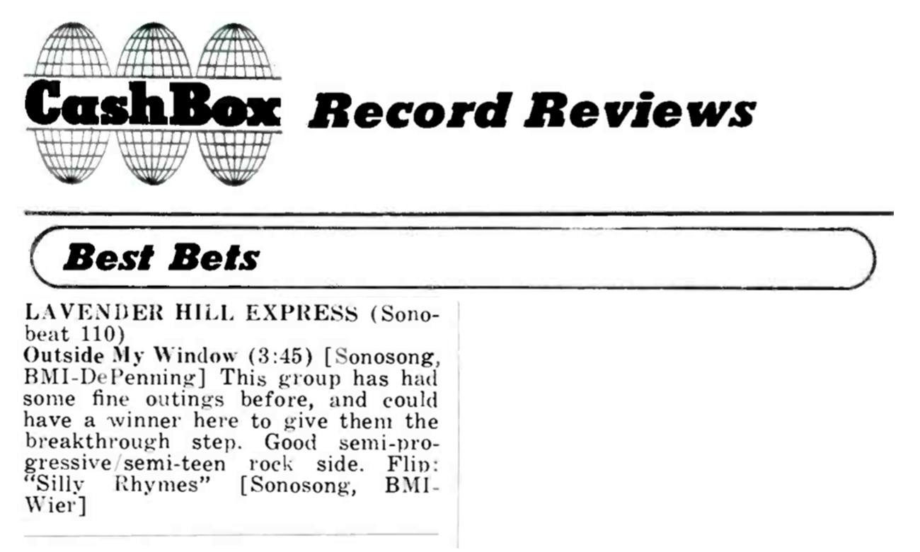 The third and final Lavender Hill Express single, recorded in September 1968 and released the following month, was Outside My Window, Layton DePenning’s experimental tune with highly visual lyrics and a jam-like progression. Sonobeat returned to The Vulcan Gas Company to record the instrumental backing track, and additional instruments and vocals were overdubbed at Sonobeat’s home-based Western Hills Drive studio. Outside My Window ran seven and a half minutes but was faded at 3:45 for the single. The flip side was Rusty Wier’s acoustic guitar and electric bass ballad Silly Rhymes, recorded entirely at the Western Hills Drive studio and one of the first sessions in which Sonobeat used its new Scully half-inch 4-track tape deck. Rim, who produced the first Lavender Hill Express single that featured a string quartet overdub, wanted to bring arranger Richard Green back to add a string section to Silly Rhymes, but Sonobeat’s heavy 1968 recording and release schedule, which stretched its resources to the limit, made the strings an unaffordable luxury. Meanwhile, Outside My Window became the only Sonobeat single released in two versions; the alternate version – distributed only to radio station deejays – offered the commercial stereo mix for FM stations on one side and a special monaural mix for AM stations on the other. The stereo/mono version of Outside My Window was’t sold to the public. The single picked up a Best Bet review from Cash Box magazine.