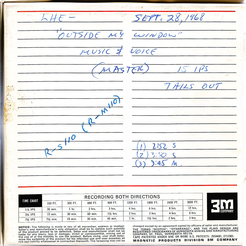 Vocal overdubs for Outside My Window recorded at Sonobeat’s Western Hills Drive studios, Austin, Texas, on September 28, 1968