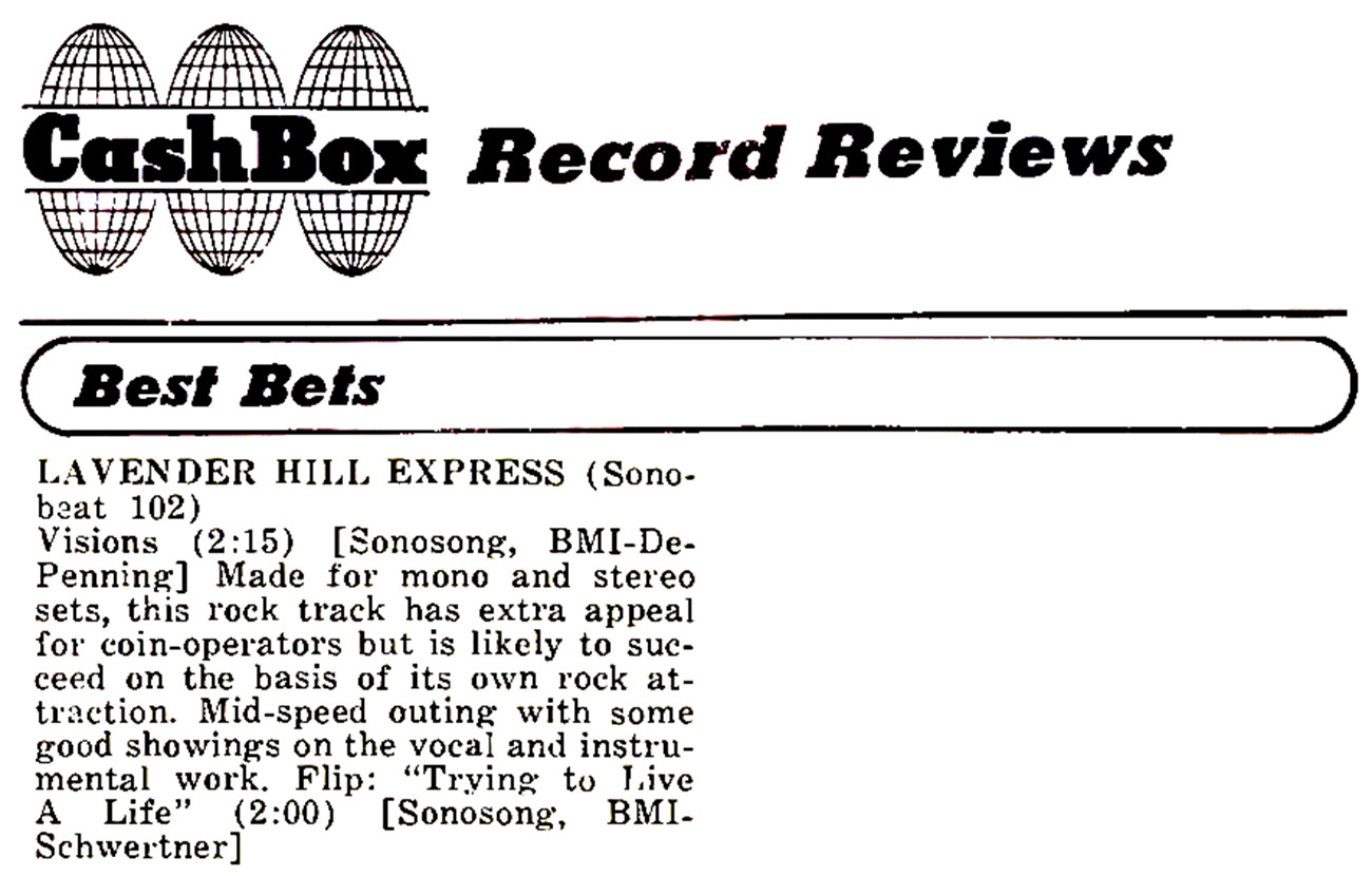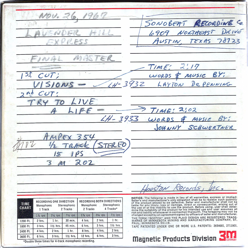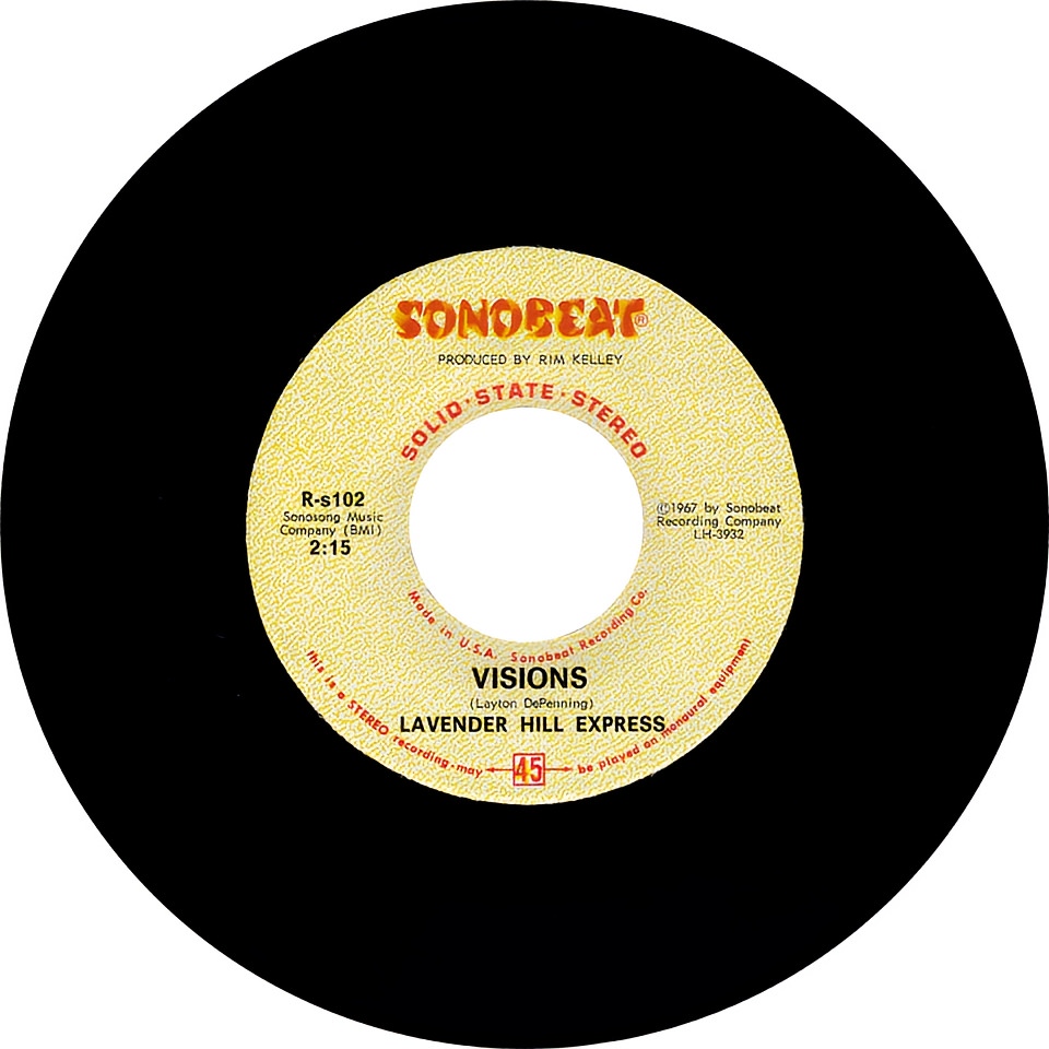 The first of Lavender Hill Express’ Sonobeat releases was guitarist Layton DePenning’s up-tempo Visions, a pop-rock tour-de-force with a catchy hook and strong vocal harmonies. The flip side was keyboardist Johnny Schwertner’s ballad Trying to Live a Life, on which Johnny also provided lead vocal. In ’67, Sonobeat had no recording studio facilities, so it rented nightclubs during their off hours and carted in its portable gear for recording sessions. Only months before, Sonobeat recorded its first single, by the Sweetarts, using the large dance floor at Swingers Club in north Austin as a mobile recording studio. Sonobeat returned there for Lavender Hill Express’ first session. The resulting instrumental backing tracks were solid, but producer Rim Kelley thought a string arrangement would add a contemporary sound, a trend popularized by The Beatles, Mamas and Papas, and Motown artists. Sonobeat hired local arranger-conductor Richard Green, who contracted a string quartet – two violins, a viola, and a cello – composed of members of the Austin Symphony Orchestra for an overdub session. Green also played harpsichord alongside the string quartet. The string and harpsichord overdub session, held at the KAZZ-FM studios in downtown Austin, were scheduled for November 25, 1967, giving Richard about a month to pencil out arrangements for both tunes. The vocal overdubs were recorded a day after the strings were recorded, also at the KAZZ studios, and on December 6th Bill Sr. drove the final mixes to Houston, Texas, for mastering and pressing by Houston Records, Inc. Lavender Hill Express’ first single barely made it out in ’67, hitting Austin record stores only days before Christmas. It sold well enough to justify a second pressing in February ’68, at which time the band made a promotional appearance at a record-signing event at G.C. Murphy, one of Austin’s leading discount record retailers in the ’60s. Collectors easily can tell whether they have a copy from the first pressing or the second pressing: the first pressing used Sonobeat’s yellow label background and the second marked the first appearance of Sonobeat’s blue label background. The February 3, 1968, edition of Cash Box named Visions a Best Bet.