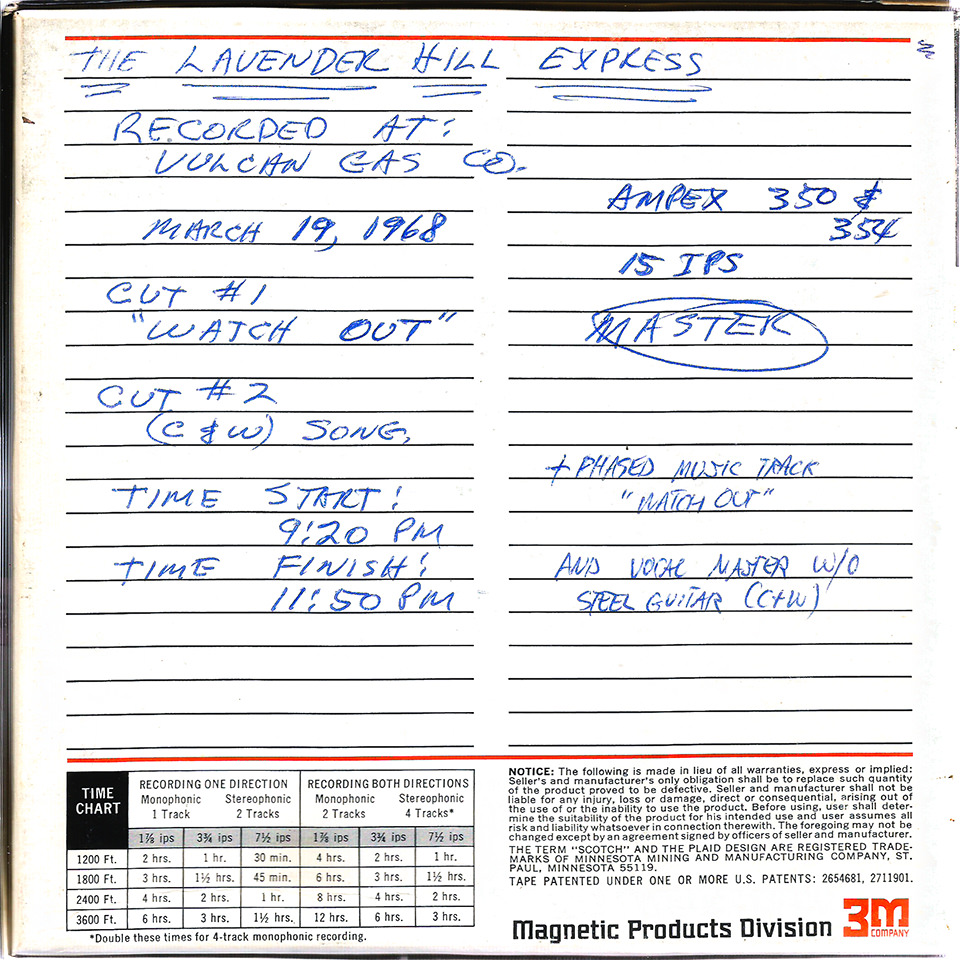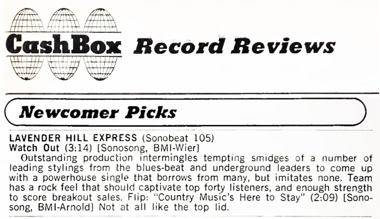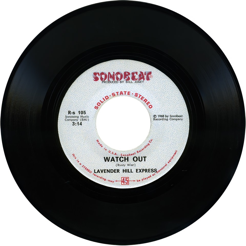 The basic tracks for Watch Out! and Country Music’s Here to Stay were recorded at Austin’s hottest music venue, The Vulcan Gas CompanyThe Vulcan was Austin’s first successful hippie music hall, opening in 1967 in an old warehouse at 316 Congress Avenue and closing in 1970. Its better known successor was Armadillo World Headquarters. in downtown Austin. The sessions were recorded during off-hours in the Vulcan’s empty auditorium-sized dance hall. The reverb on Rusty Wier’s rim shot, used as punctuation in the chorus of Watch Out!, was created by placing a mike at the far end of the hall; the mike was turned on just as Rusty hit his snare to capture the Vulcan’s booming acoustics. With he Vulcan sessions completed, back at Sonobeat’s home-based Northeast Drive studio in Austin, engineer Rim Kelley flangedFlanging is a sweeping audio frequency comb filter created by playing two identical tapes on synchronized tape decks and recording the combined output onto another tape deck while lightly and alternately dragging a thumb on the outer flange of each tape reel during playback; the resulting slight frequency offsets create a swooshing sound. Modern digital audio workstations create a similar effect with the turn of a knob. the instrumental track for Watch Out! before the lead guitar and vocals were overdubbed. Although the basic instrumental track was flanged throughout, the effect is timed to create a particularly dramatic swoosh on the snare reverb. Rim recalls that the inspiration for adding the flanging effect was The Small Face’s 1967 hit Itchycoo Park, itself heavily flanged between verses. Sonobeat’s second Lavender Hill Express single was released regionally in June ’68 and garnered a Cash Box magazine Newcomer Pick review.