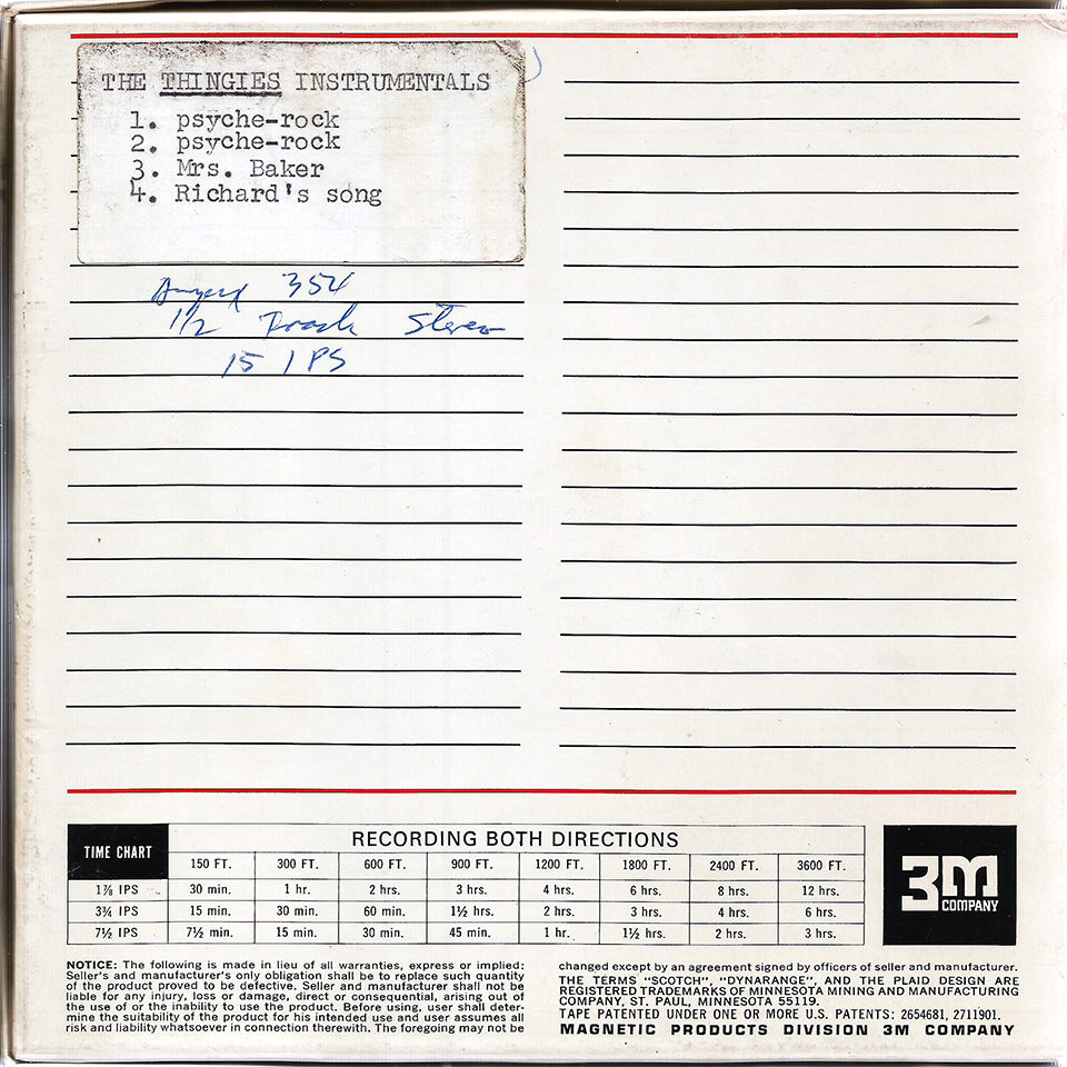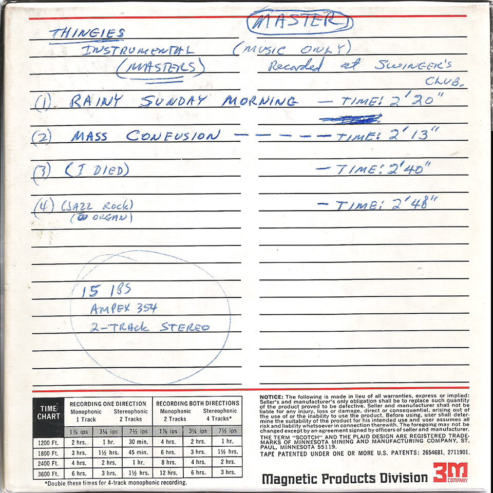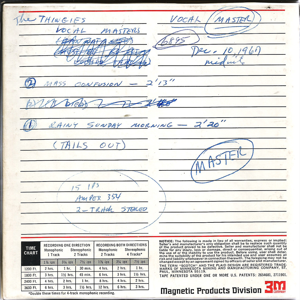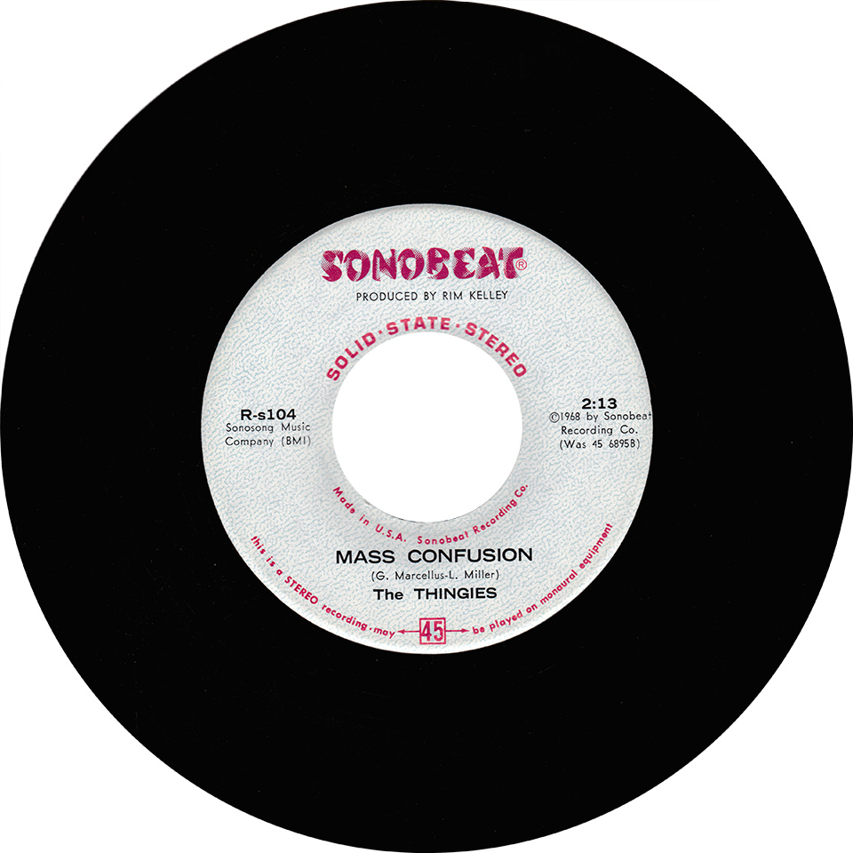 Mass Confusion, the “A” side of The Thingies Sonobeat single, is a self-fulfilling song about... what else... confusion, penned by bandmates Gordon Marcellus and Larry Miller. The “B” side, Rainy Sunday Morning, by group members Phil Weaver and Bob Cole, is a disfunctionally reflective song that easily could have been written and recorded by Jim Morrison and the Doors. The Thingies’ Sonobeat sessions also yielded instrumental masters for original tunes I Died, Mrs. Baker, Richard’s Song, and an untitled jazz rock tune, none of which were ever completed with vocal overdubs. Before they had titles, Mass Confusion and Rainy Sunday Morning were referred to on the instrumental master tape boxes as Psyche-rock. The finished tracks for The Thingies’ single sat for a few months while Sonobeat sorted out whether its singles by The Conqueroo and Shiva’s Headband would be released ahead of The Thingies. All three bands recorded with Sonobeat in the same general time frame. While sorting out the release schedule, Sonobeat co-founder Bill Josey Sr. had a test pressing – perhaps as few as five copies, each sporting a blank white label – manufactured to check the sonic quality on vinyl before ordering the commercial press run. The Thingies’ single finally made it out a week after The Conqueroo’s I’ve Got Time was released, in April 1968 (the Shiva’s Headband single ended up shelved and never released). The Thingies release delay didn’t seem to have any negative impact: Mass Confusion was well received critically and got local and regional radio airplay although it received no national music trade journal reviews.