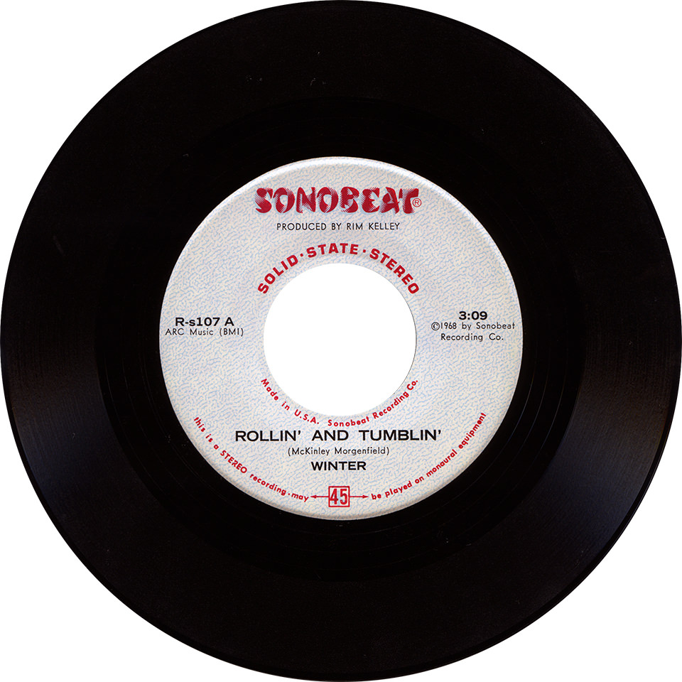 Initially, in September 1968, Sonobeat released a Winter 45 RPM single featuring a high energy performance of McKinley Morgenfield’s Rollin’ and Tumblin’ (“A” side) and the guitar tour de force Mean Town Blues (“B” side), written by Johnny. The single was packaged in a black and white picture sleeve designed by producer Rim Kelley and featuring an appropriately stark photo of Johnny taken by Burton Wilson. An alternate, two-sided sleeve used film strips from Burton’s photo shoot for the backside of the single sleeve that appeared on as few as 100 copies of the single. Although Rim has no recollection of designing it, the Sonobeat archives include the black and white contact sheet that was used to create the backside of the ultra-rare alternate sleeve.