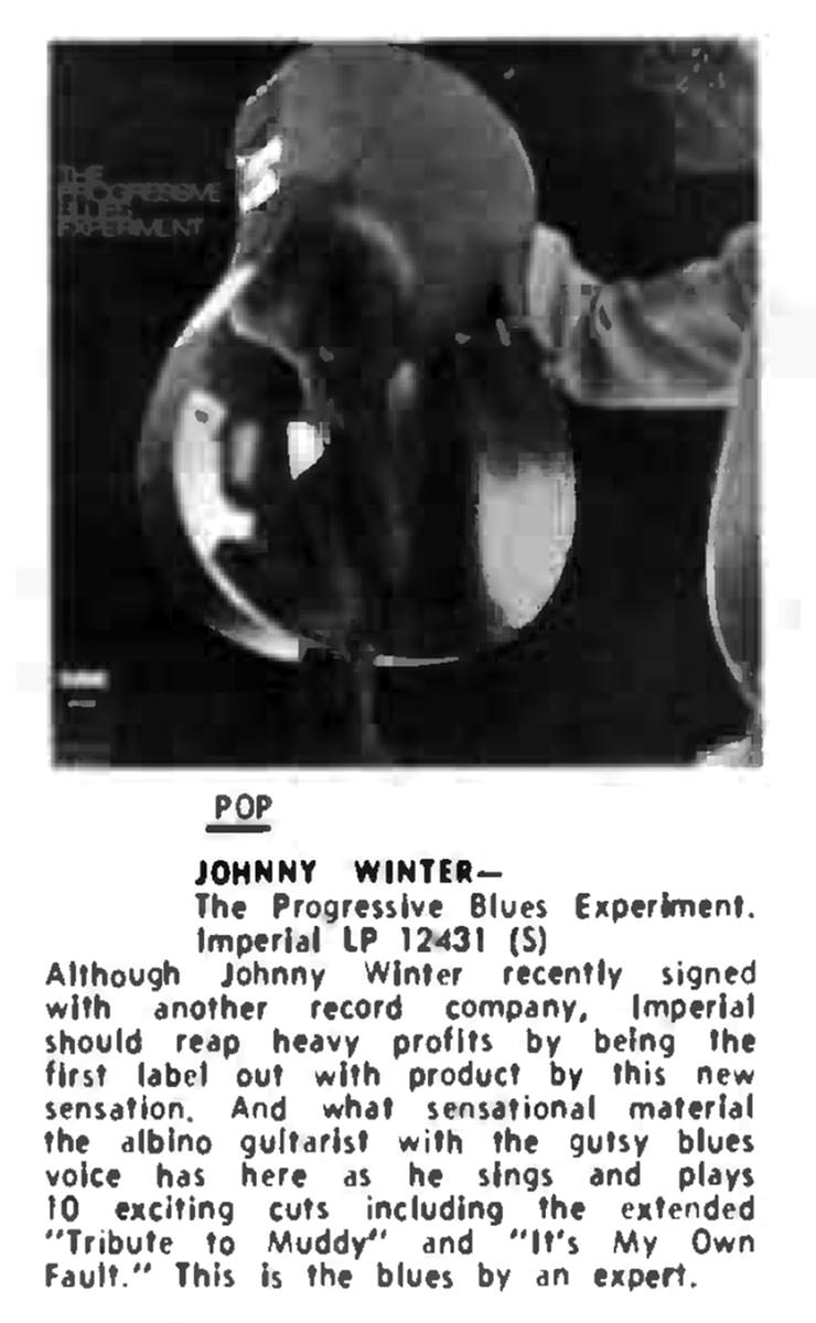 After recording the album, in October ’68 Johnny made a trip to the U.K. to check out its music scene. There he was introduced to the Vernon brothers who owned a young but successful London-based blues specialty label, Blue Horizon Records. Johnny played the Sonobeat album for the Vernons, and by November, Sonobeat had entered into negotiations to license The Progressive Blues Experiment to Blue Horizon for distribution in the U.K., Europe, and Canada. By the time Johnny returned to the U.S. in early December, a Rolling Stone magazine article by Larry Sepulvado and John Burks, proclaiming Johnny one of the hottest blues performers out of Texas, changed everything: wooed to New York by Steve Paul, owner of hot Manhattan nightclub Scene, Johnny signed a six-hundred thousand dollar contract with Columbia Records, the largest advance the label had ever given any artist at the time, who rushed him into its Nashville studios to cut an album in January ’69.