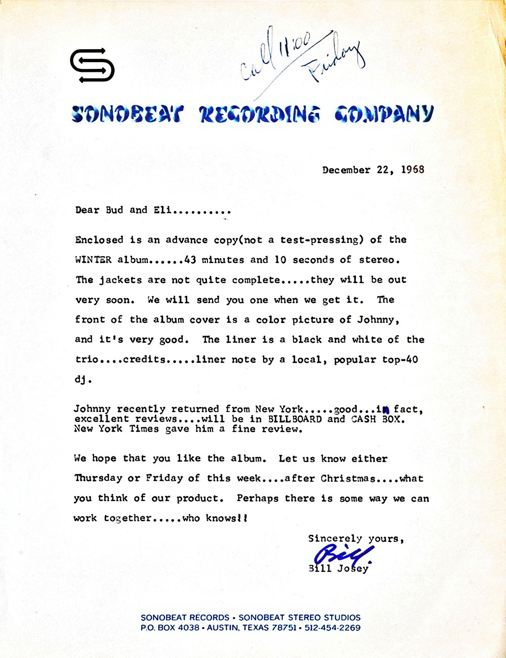 On the heels of the Rolling Stone article, Winter performed at San Francisco’s Fillmore West rock ’n’ roll music venue in a performance attended by Los Angeles-based Liberty Records execs, who wanted to see and hear firsthand what all the Johnny Winter commotion was about. In a frantic conversation with Johnny following the performance, the Liberty execs learned that Johnny already had an album “in the can”, got details, including Sonobeat’s Austin phone number, and immediately called Bill Josey Sr. to open negotiations. Bill Sr. put the Blue Horizon discussions on hold and, as Christmas week 1968 began, airmailed numbered copy #48 of the album advance pressing to Liberty’s Bud Dain and Eli Bird along with a short cover letter. From there, things moved lightning fast because Liberty was afraid they might lose the album: Eli called Bill Sr. on Friday, December 27th, to make what he hoped would be a preemptive offer. By January 15, 1969, after several negotiation phone calls, a deal was agreed, and Bud and Eli ordered Liberty’s legal department to rush out a contract. Within little more than a week the contract was reviewed, negotiated, and signed. Immediately on closing the sale of The Progressive Blues Experiment to Liberty, Sonobeat ceased distribution of its Winter single (which featured two tracks from the album) and terminated negotiations with Blue Horizon. The Liberty deal done, the Joseys drove 1,400 miles to Los Angeles to hand deliver the master tapes to Liberty’s execs. The week of March 10, 1969, Liberty released the Sonobeat-produced album on its Imperial label (as LP-12431), beating Johnny’s Columbia debut album to market by two weeks. Thus, the Sonobeat album holds the distinction of being both the first Winter album recorded and the first released.