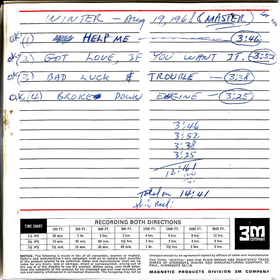 Bad Luck and Trouble and Broke Down Engine recorded at Sonobeat’s Western Hills Drive studio, Austin, Texas, on September 1, 1968