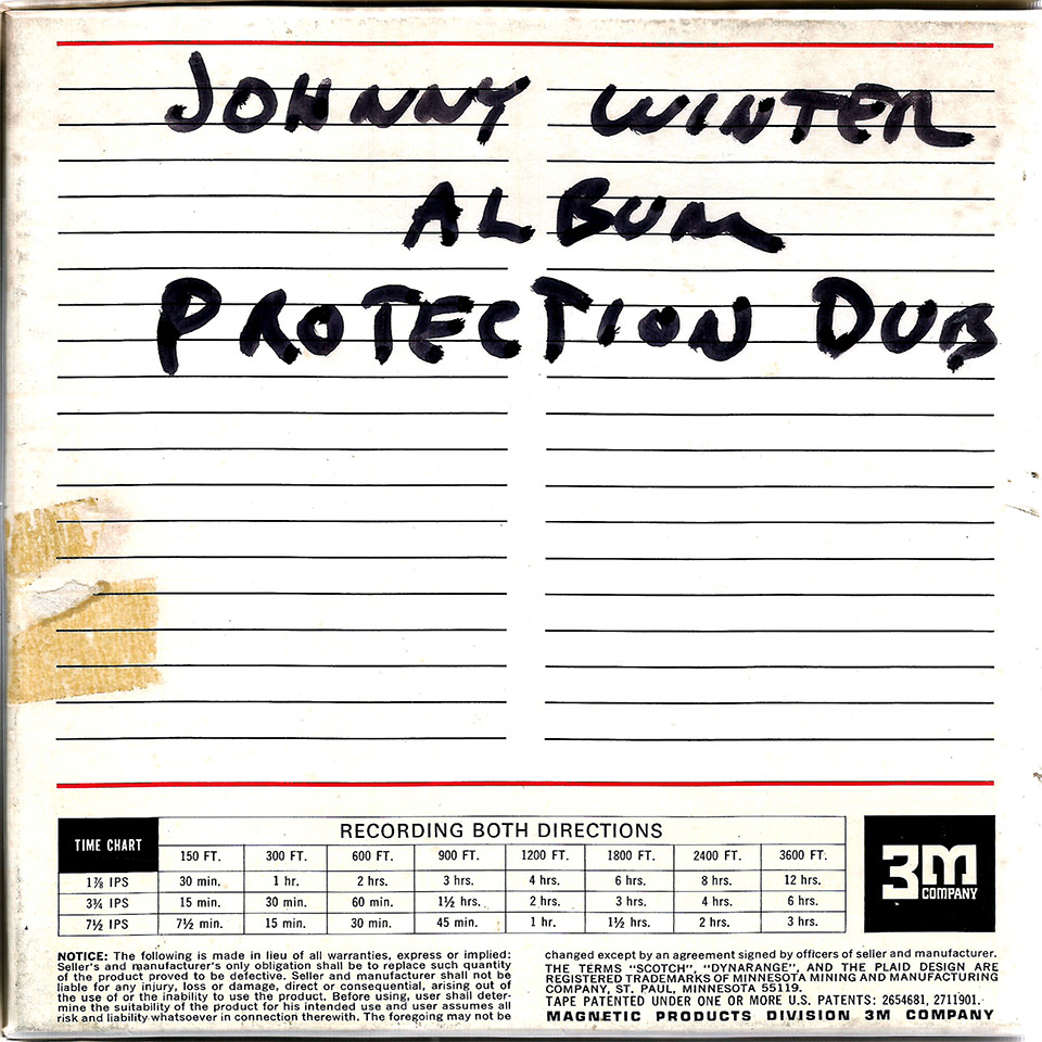 To capture Johnny’s “guttural, edgy” sound (as CREEM Magazine writer Lester Bangs described it), Sonobeat recorded the Winter trio at The Vulcan, where they could play at full performance volume. Although the resulting tracks have a distinctive live sound, raw and primal, they were recorded during daylight hours, when The Vulcan was closed. On August 18, 1968 (a Sunday), and again the following day, with Uncle John’s drum kit on the Vulcan’s raised stage and Johnny’s and Tommy’s guitar amps on the dance floor, Sonobeat co-founder and producer Rim Kelley“Rim Kelley” was the pseudonym used by Sonobeat co-founder Bill Josey Jr. as a radio deejay in Austin, Texas, during the 1960s and as a Sonobeat producer from 1967 to 1970. used only half a dozen dynamic and two condenser microphones to cover the band. An additional mike, set up at the back of the hall, captured The Vulcan’s cavernous acoustics (owing to the giant empty cistern under The Vulcan’s floor). To set the mood, Vulcan Gas Company artist-in-residence Jim Franklin set up a pulsating liquid light showPut water and colored oils in a small glass tray, add heat and an overhead projector, and you get a kinetic visual experience that plays well with hallucinogens.. Although The Vulcan sessions were not recorded before a live audience, they were mixed “live”; that is, the instrumental tracks were mixed at the same time as recorded to a quarter-inch 2-track Ampex 354 tape deck through Sonobeat’s custom 10-input portable stereo recording console, and once printed to tape could not be remixed. The vocals were overdubbed later in the same sessions by combining the instrumental track playback from one Ampex tape deck with Johnny’s vocal overdubs to another Ampex. The Vulcan sessions yielded eight electrified and electrifying tracks on which Johnny played a 12-string Gibson Firebird V-12, from which he’d removed six strings, and a Fender Mustang.